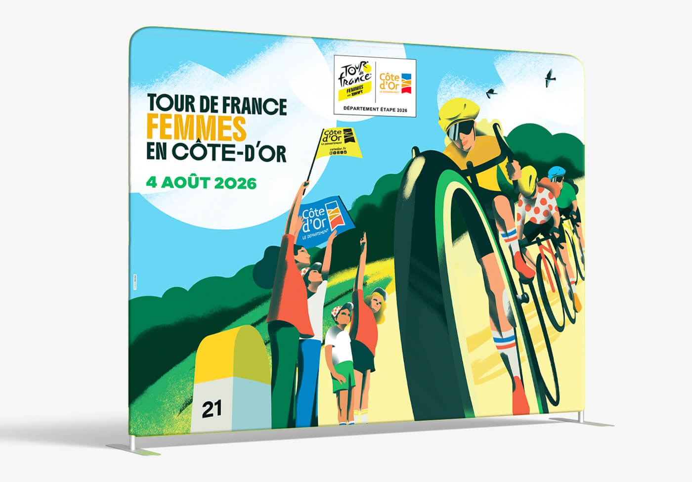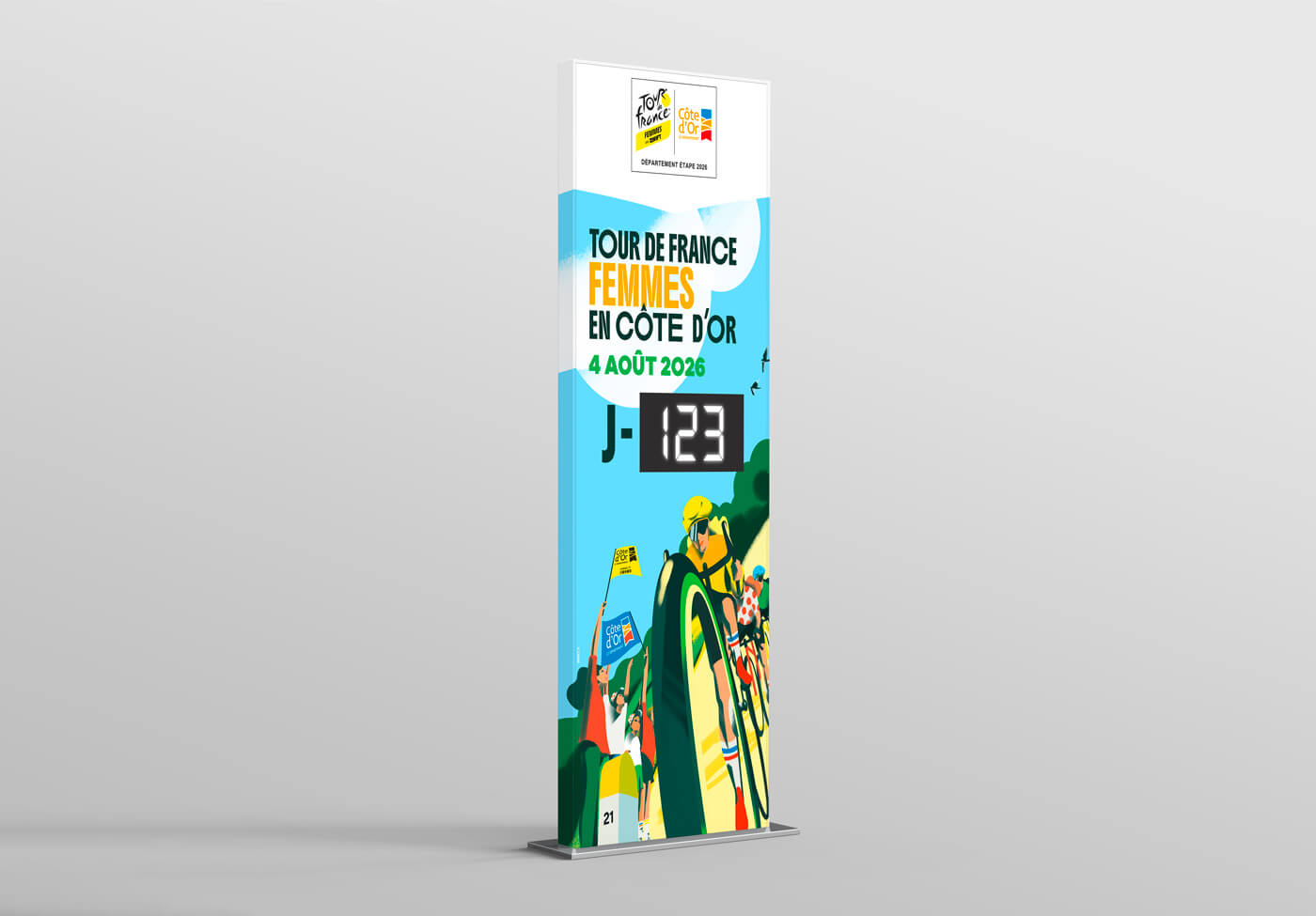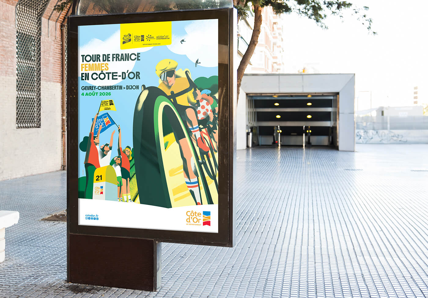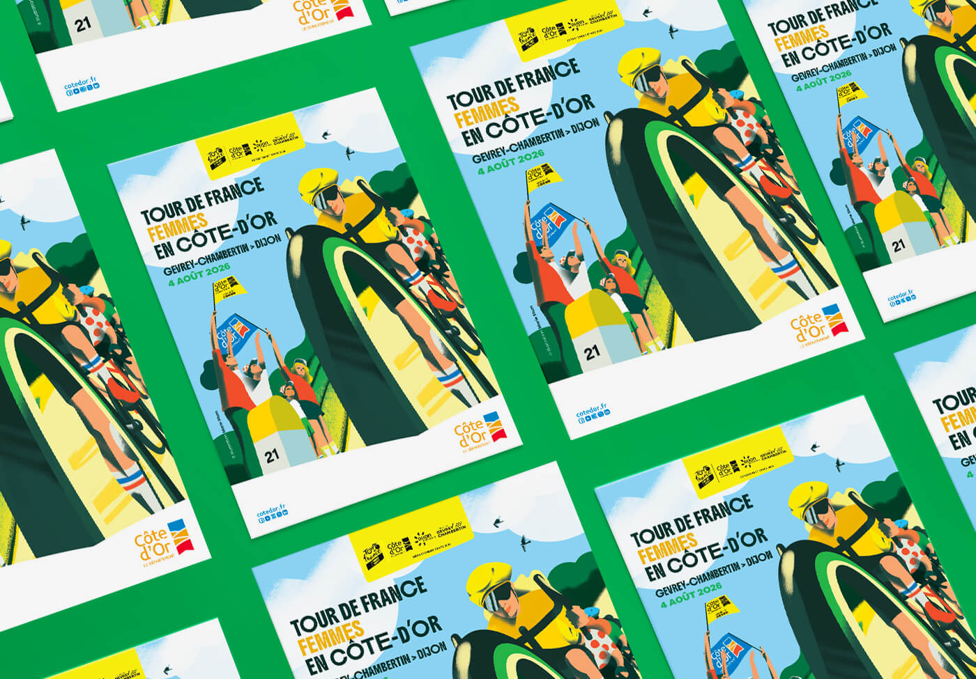 Le département de la Côte d’Or m’a confié la création de l’univers visuel de cet évènement. Un très beau projet qui se décline sur tous les supports de communication tels que le fond de scène, le totem compte à rebours, le dossier de presse, les affiches, le flocage des véhicules, les visuels réseaux sociaux et site internet…
