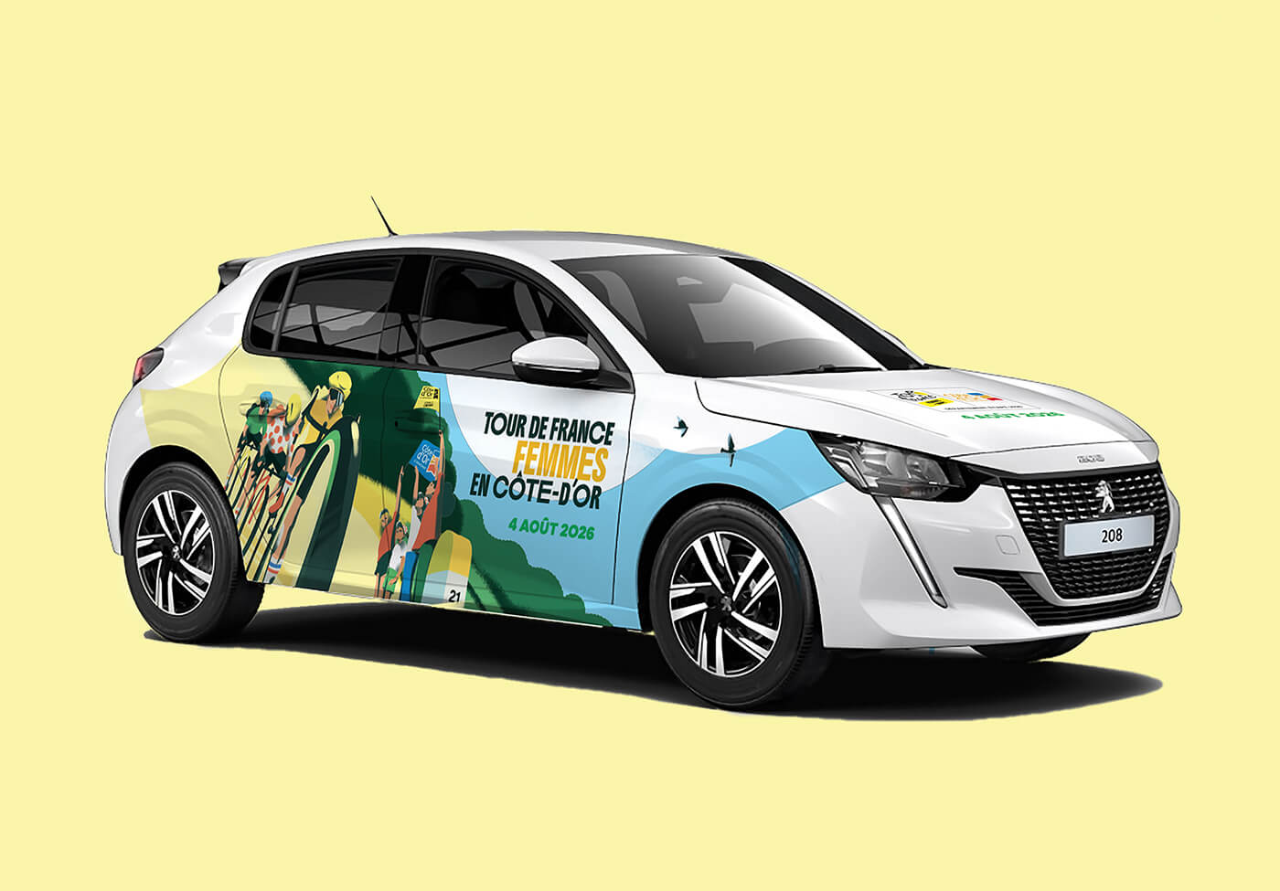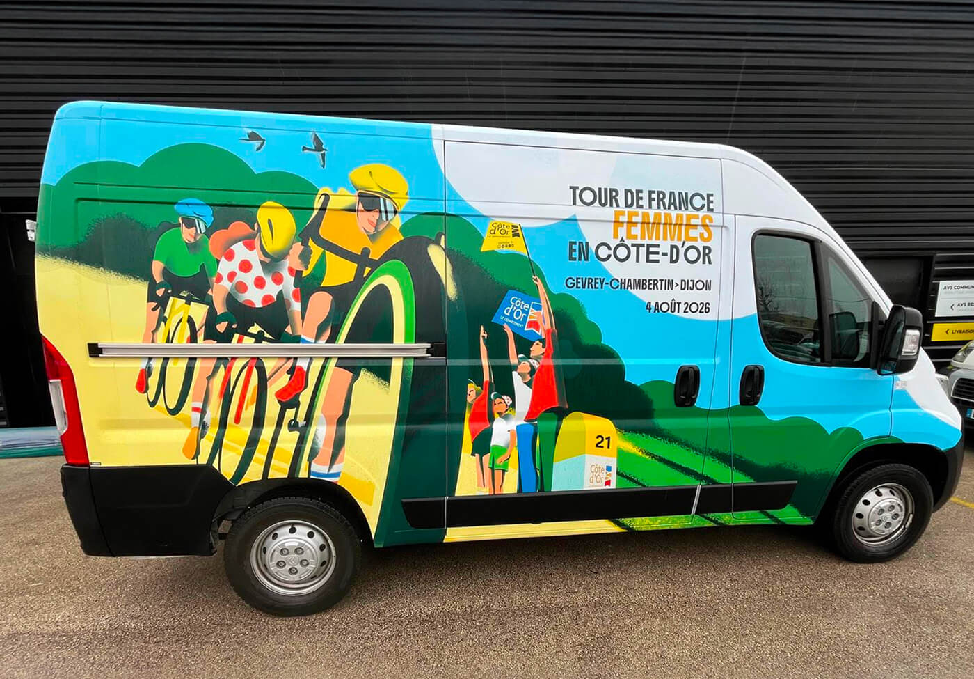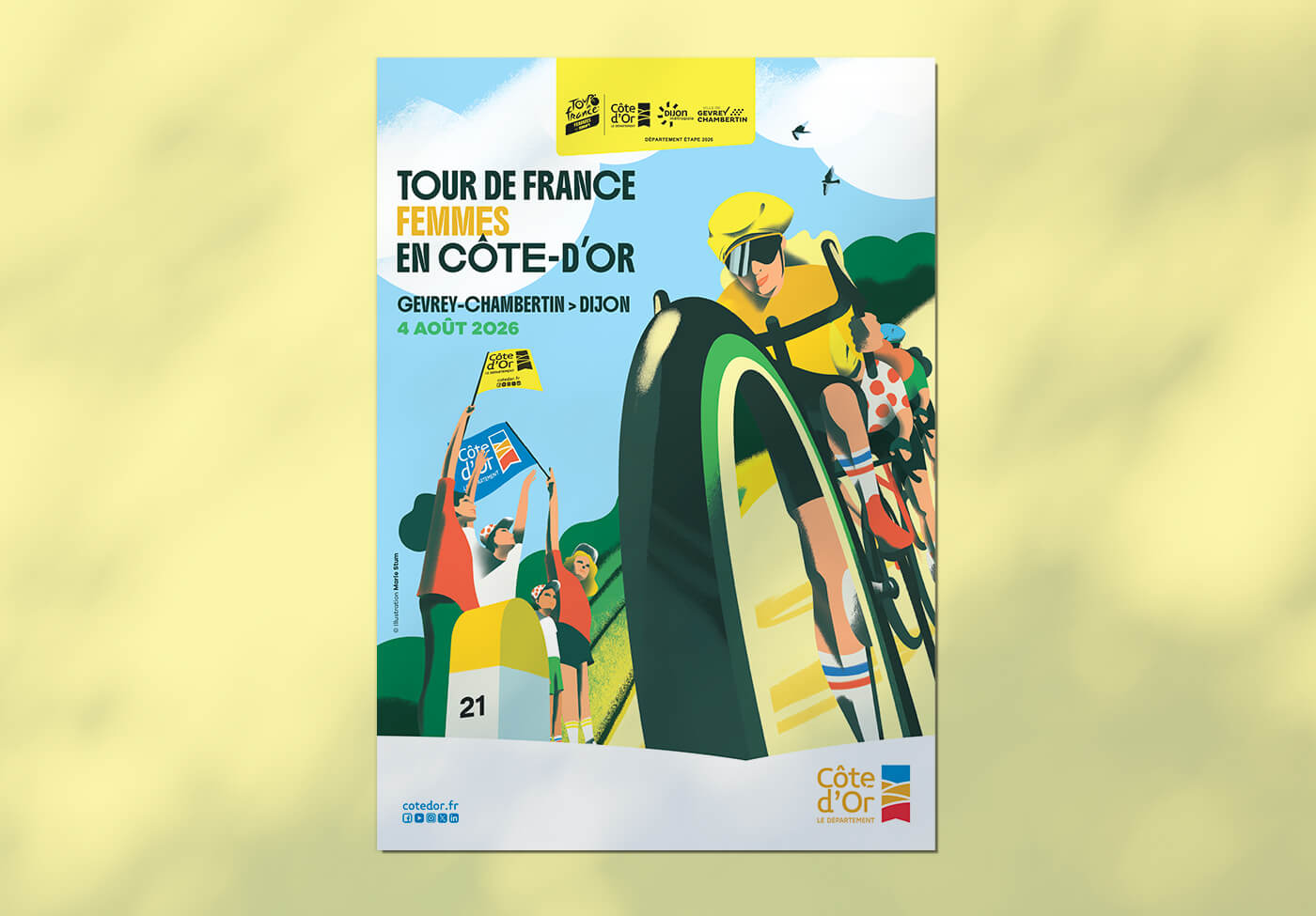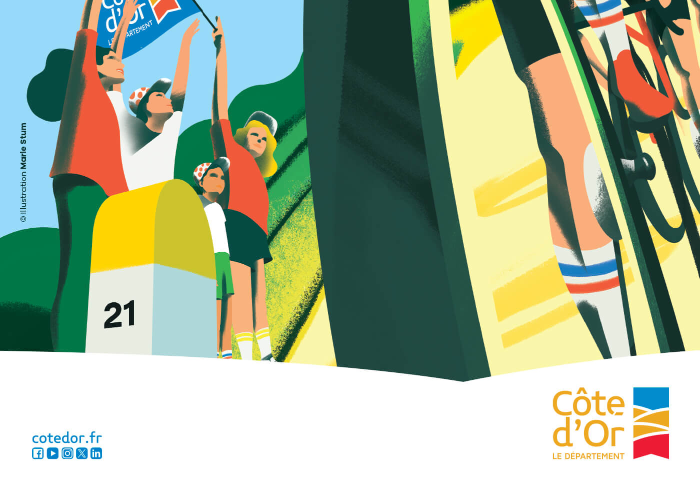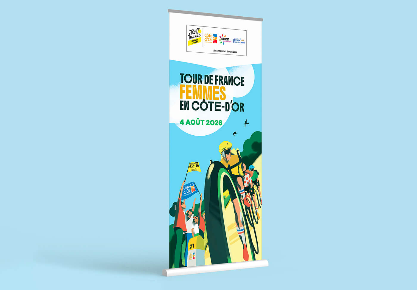 Le département de la Côte d’Or m’a confié la création de l’univers visuel de cet évènement. Un très beau projet qui se décline sur tous les supports de communication tels que le fond de scène, le totem compte à rebours, le dossier de presse, les affiches, le flocage des véhicules, les visuels réseaux sociaux et site internet…
